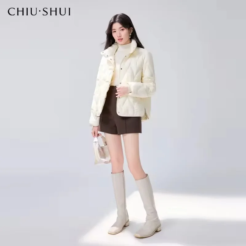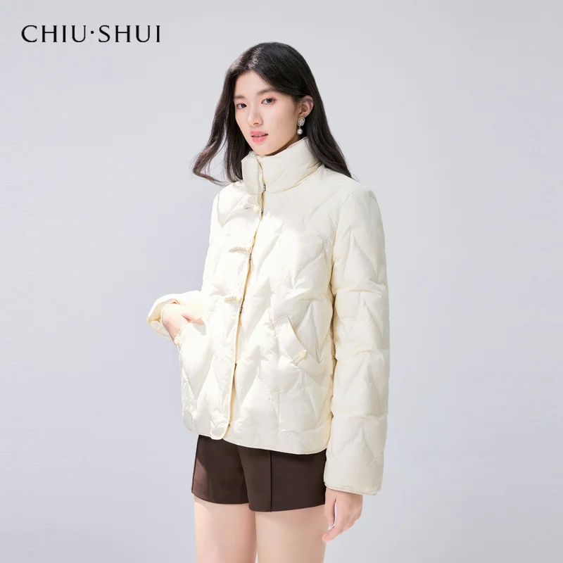 Women's Casual Fashion Down Jacket Guofeng Warm Short with Stand Collar and Snake Skin Leather